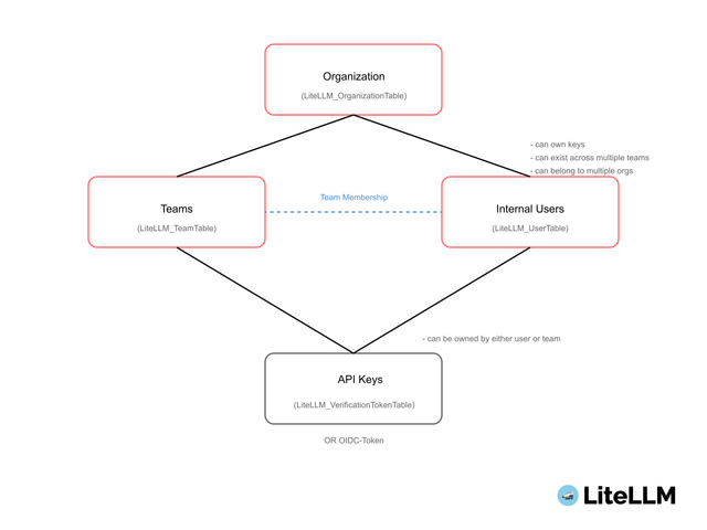 • Virtual Keys - Keys are used for authentication to the LiteLLM API. Keys are tied to a Internal User and Team